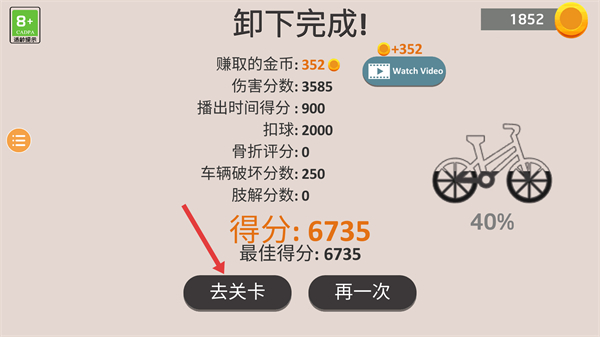 4、卸下完成后獲得【得分-6735】與【+352-金幣】,點擊【去關卡】進入下一關。