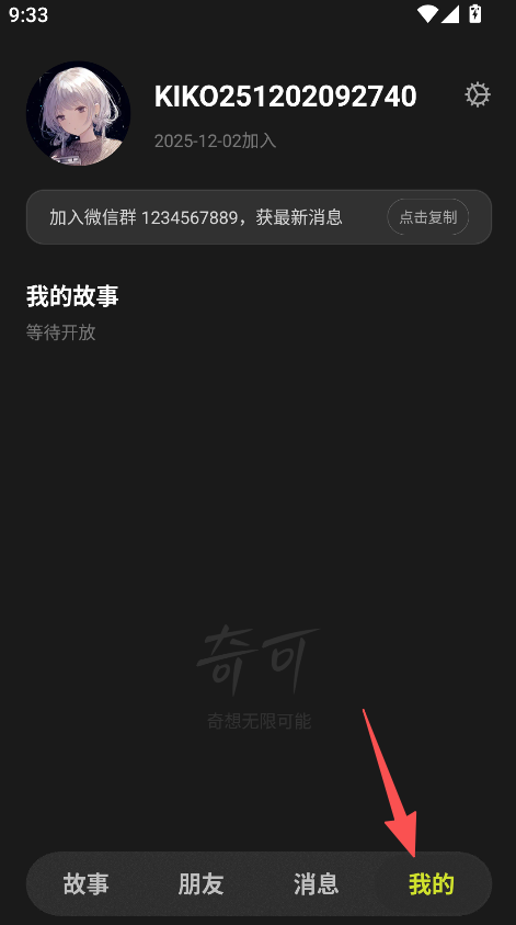 1、劃分故事朋友消息我的等板塊,我的板塊展示賬號信息及微信群提示,便于快速進入對應(yīng)板塊開展操作。