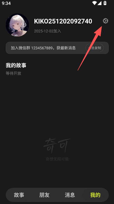 《奇可-奇想無限可能》是一款社交類軟件,設(shè)有故事朋友消息我的等板塊,進入我的板塊可查看賬號信息及加入微信群的提示,我的故事板塊待開放。在我的板塊點擊設(shè)置圖標(biāo),可進入設(shè)置頁面,該頁面包含個人信息賬號安全推送通知等選項,還能進行清理緩存操作,也可提交反饋建議,底部設(shè)有退出登錄功能,滿足賬號相關(guān)的各類操作需求,讓賬號管理更便捷有序,覆蓋賬號信息查看與設(shè)置操作的核心需求。