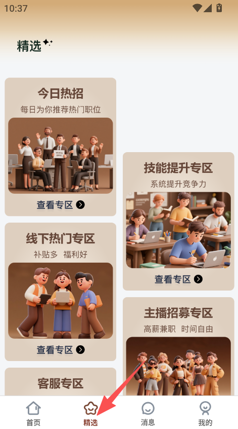 1、點擊精選,進入精選板塊后點擊今日熱招的查看專區。