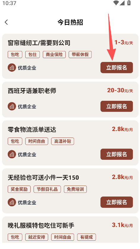 2、在今日熱招頁面選擇目標職位,點擊該職位對應的立即報名。