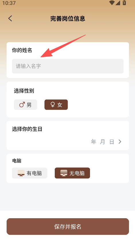 3、進入完善崗位信息頁填寫信息,點擊保存并報名完成職位申請。