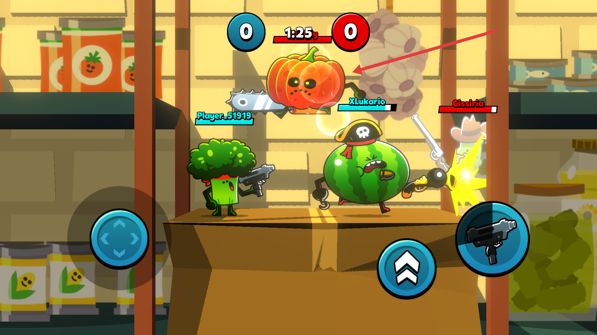 1、戰斗時用【移動按鈕】操控角色走位,借助【射擊按鈕】瞄準【南瓜】等敵人攻擊,避開對手武器攻擊保存自身安全。