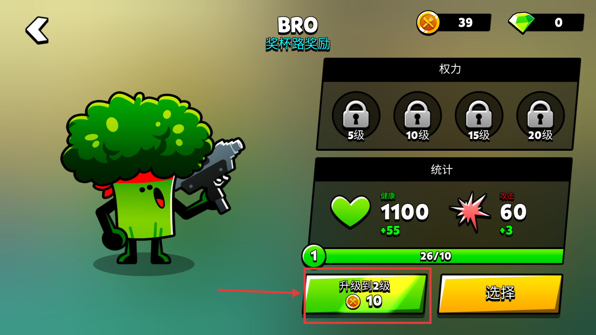4、積累足夠【獎杯】后點擊【升級到2級】按鈕提升等級,增加【健康】與【攻擊】屬性來增強戰斗能力。