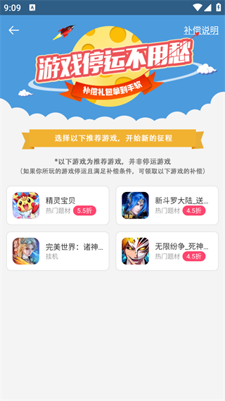 3、補(bǔ)償頁(yè)面中,點(diǎn)擊右上角【補(bǔ)償說(shuō)明】,查看停運(yùn)補(bǔ)償?shù)囊?guī)則與推薦游戲。