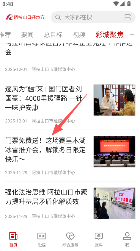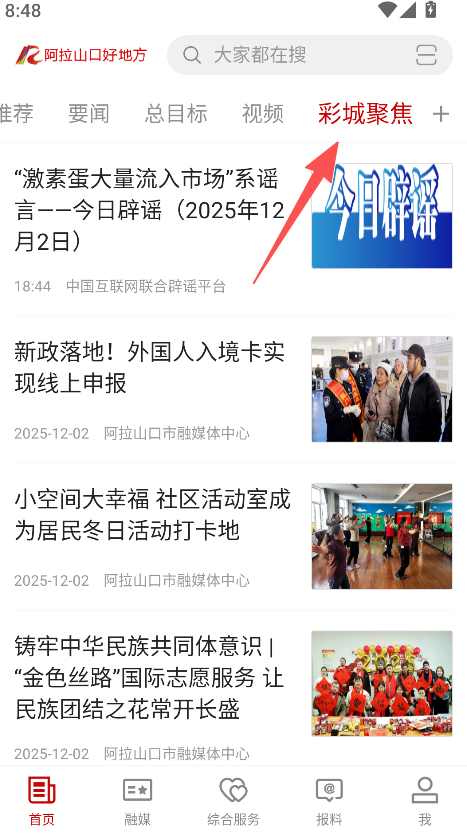 1、打開阿拉山口好地方進入首頁,選擇彩城聚焦分類查看本地資訊列表。