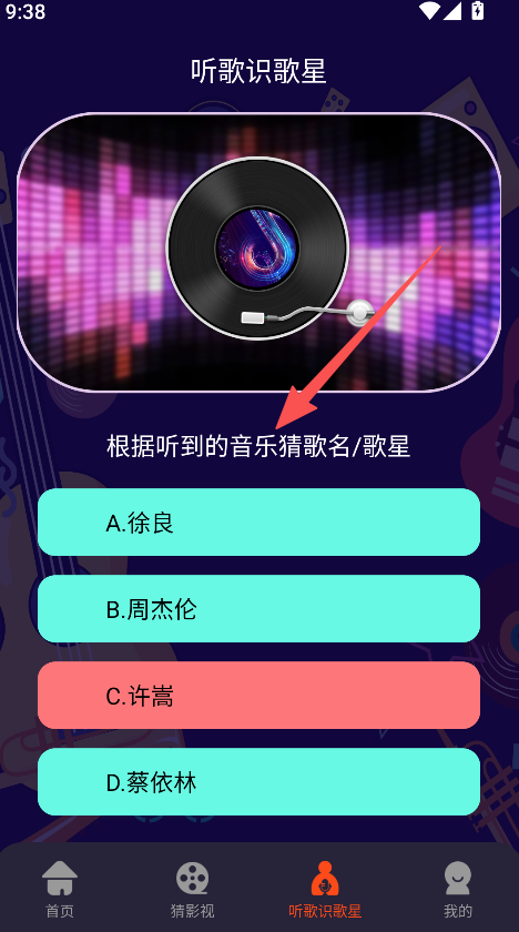 2、在聽歌識歌星頁面根據聽到的音樂,選擇對應歌星選項完成猜測。
