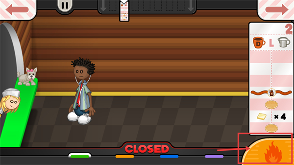 1、看到界面顯示【CLOSED】時,注意右側火焰標識,點擊可進入廚房,同時留意顧客狀態。
