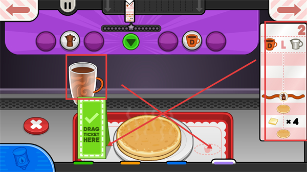 3、按右側需求準備好餐食與【咖啡杯】后,將【DRAG-TICKET-HERE】對應的票據拖拽至指定區域完成配餐。
