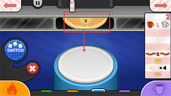 1、看到標(biāo)有【2】的煎餅時(shí),將其拖拽至下方圓盤處,完成煎餅的轉(zhuǎn)移步驟,同時(shí)可借助【SWITCH】按鈕切換操作。