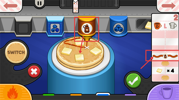 2、按右側(cè)需求,先放置黃油塊,再用醬料瓶在煎餅上添加對(duì)應(yīng)醬料,完成配料裝飾后點(diǎn)擊【√】確認(rèn)。