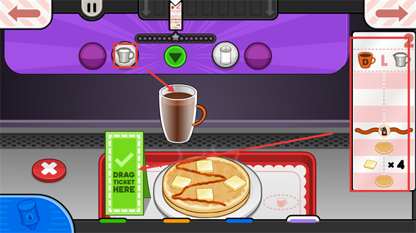 3、制作好飲品后,將【DRAG-TICKET-HERE】對(duì)應(yīng)的票據(jù)拖至指定區(qū)域,完成餐食與飲品的配餐組合。