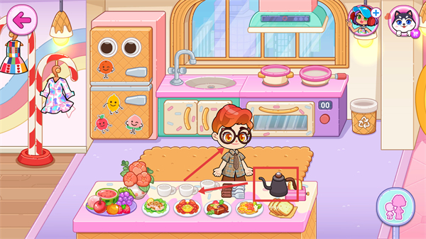 2、在廚房界面,跟隨指引獲取【水壺】,搭配桌上的餐具與餐品,完成物品的對應操作任務,以此推進當前的廚房互動流程。