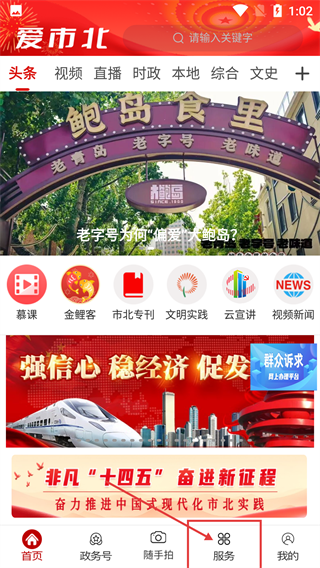 1、在【愛市北】首頁,可看到各類資訊板塊,點擊底部導航欄的【服務】選項,即可進入對應的服務功能頁面,推進后續操作。