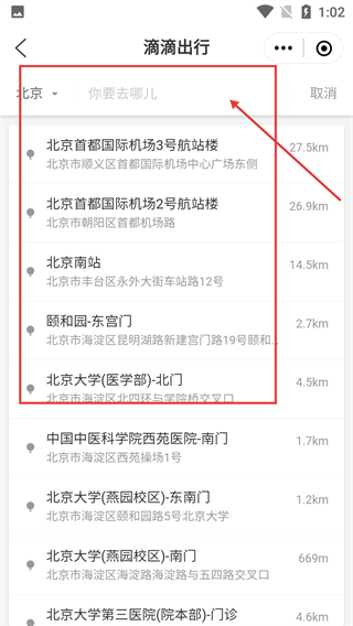 4、點擊【你要去哪】后會彈出目的地列表,可從如【北京首都國際機場3號航站樓】等推薦地點中選擇,確定后即可繼續呼叫快車的流程。