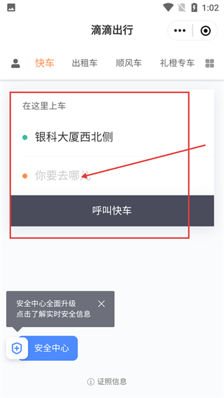 3、進入【滴滴出行】的【快車】界面后,確認【在這里上車】的地點信息,點擊【你要去哪】輸入框填寫目的地,之后可操作【呼叫快車】。