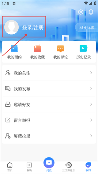 2、進入該頁面后,可見【登錄/注冊】入口,點擊它可進入登錄界面,頁面還設有【我的預約】-【我的收藏】等功能選項。