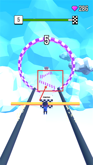 3、接近【圓環障礙】時,調整角色身體長度穿過圓環,同時收集內部道具,向【FINISH】標識的終點沖刺。