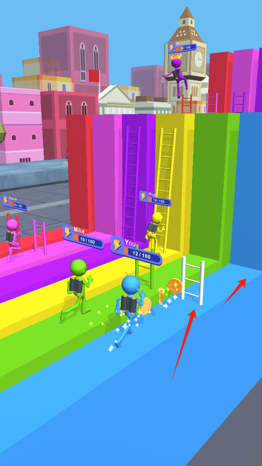 1、玩法特色:以爬梯為核心,搭配障礙跨越、道具使用等玩法,賽道設(shè)置多樣機關(guān),需搭建梯子、精準(zhǔn)跳躍完成向終點的推進。