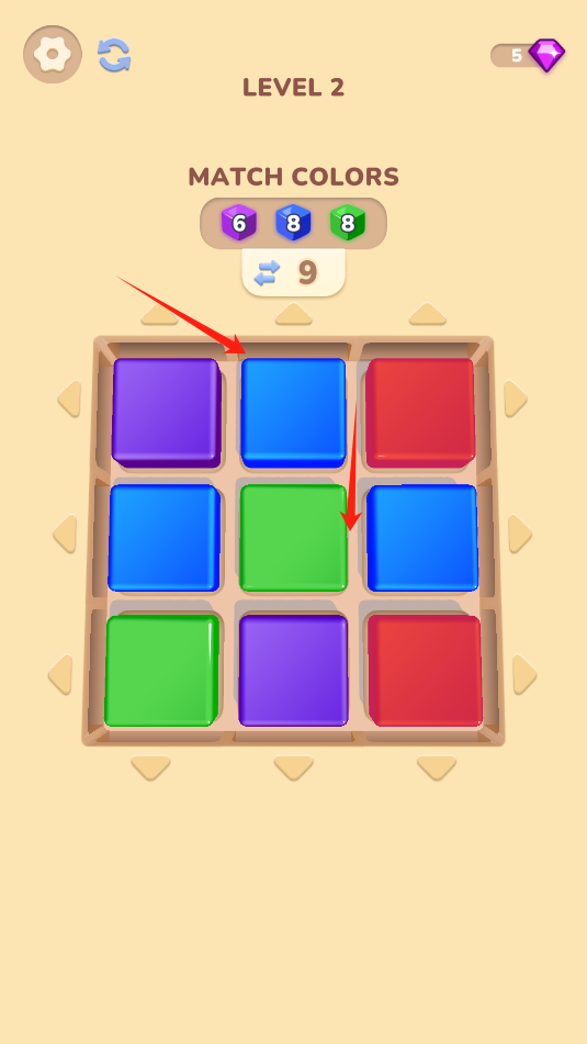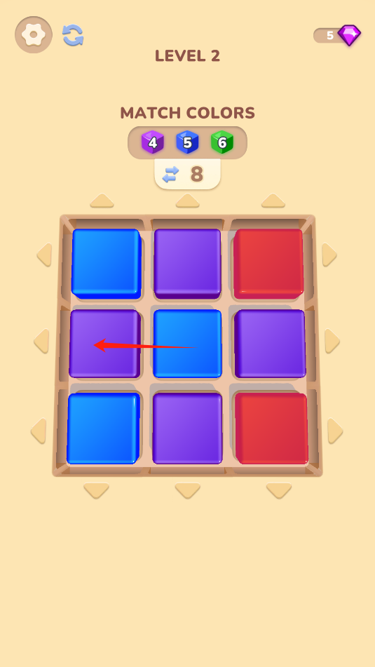 2、向左移動中間的藍色方塊一步,可以消除藍紫各3塊。
