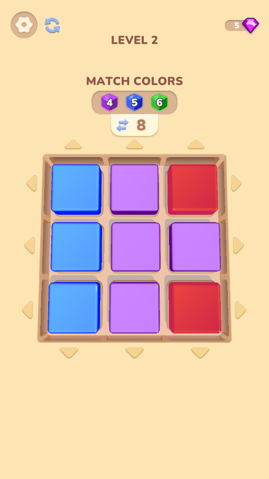 1、點擊滑動方塊,讓同顏色的2個或3個方塊相連即可消除,可上下左右滑動。