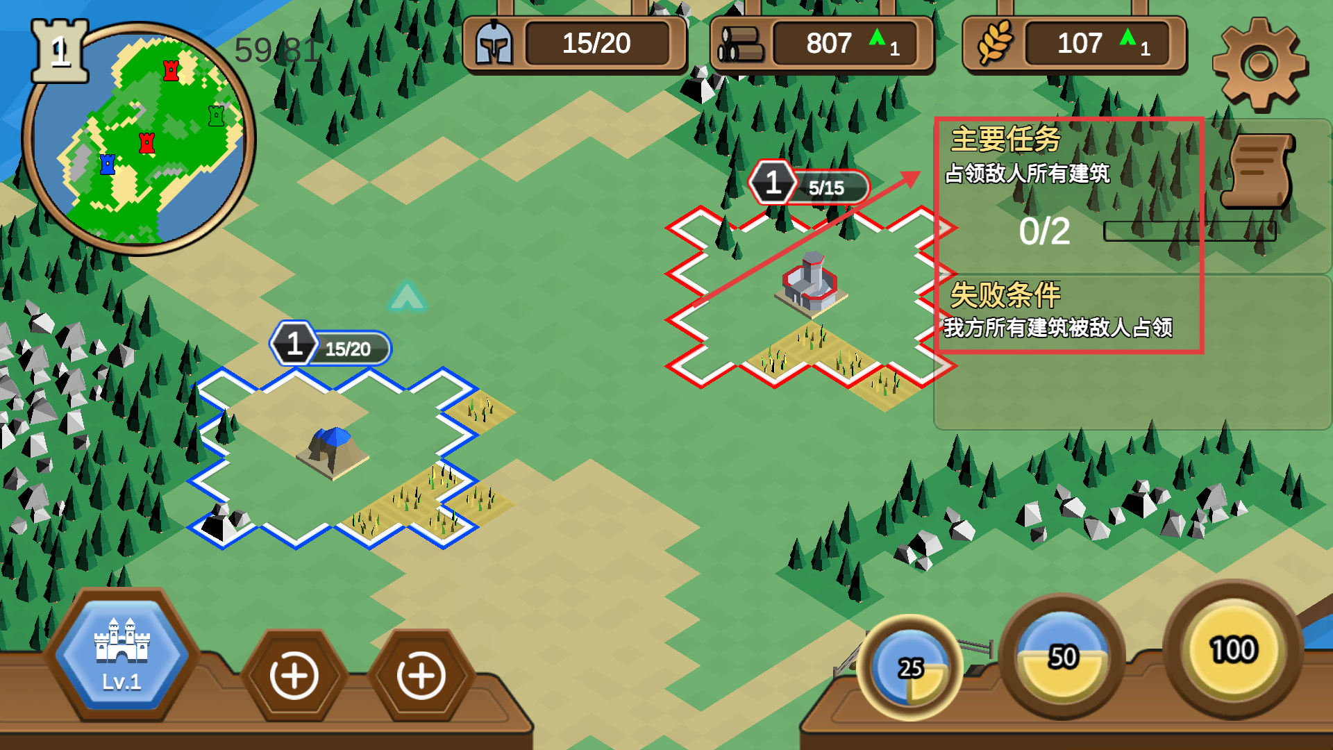 2、進入關卡后緊盯【主要任務】-【占領敵人所有建筑】,同時防范【失敗條件】-【我方建筑被占領】,優先守護核心建筑。