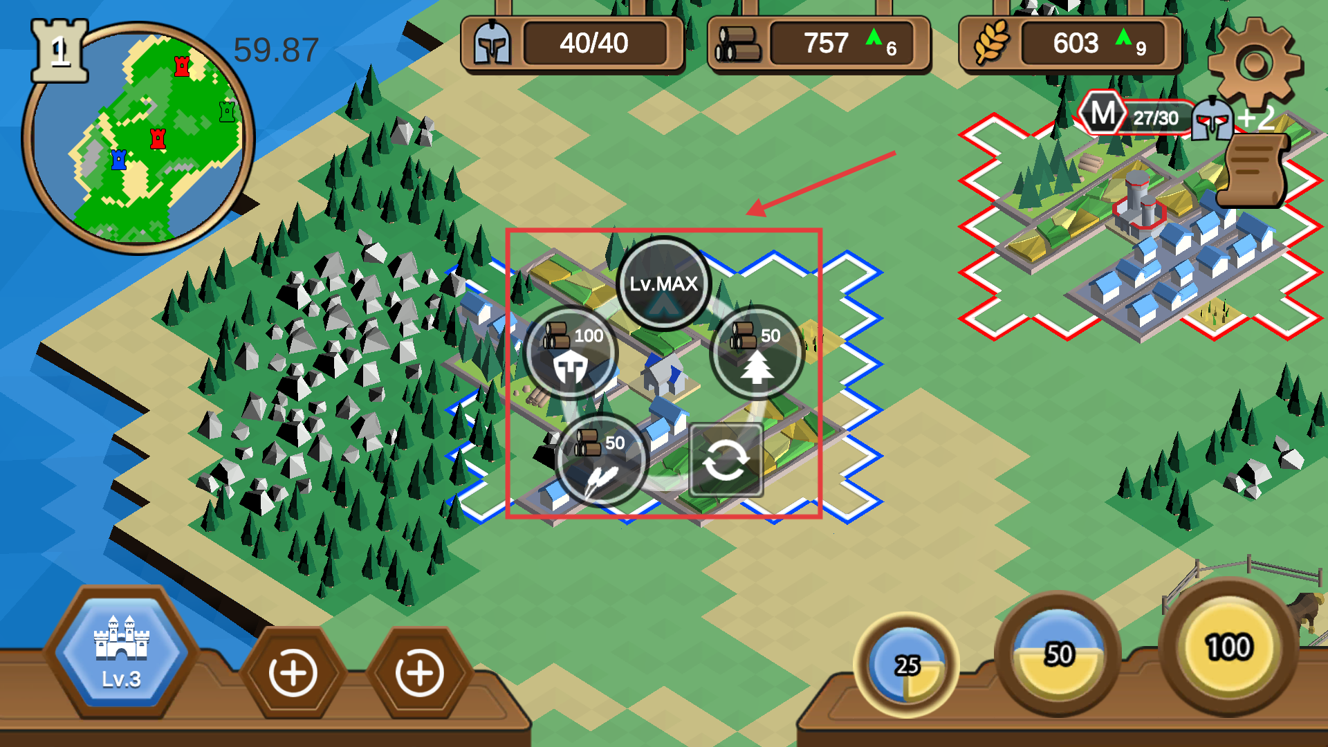 3、升級時優先把【兵營】-【伐木場】升到【LvMAX】,合理分配資源以提升士兵訓練和資源采集的效率。