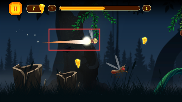 3、飛行時避開障礙,用螢火蟲的光效區(qū)域推進,同時遠離紅眼睛的敵對昆蟲。