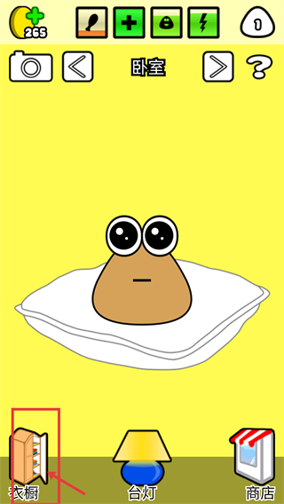 1、在【臥室】場景中點擊被框選的【衣櫥】,可進入角色裝扮界面,解鎖身體顏色、服飾等裝扮選項。