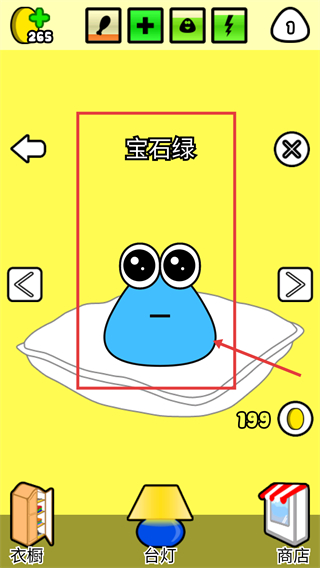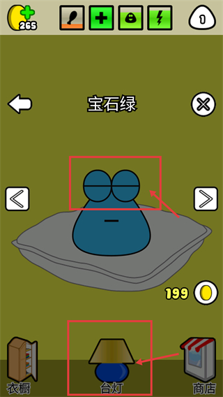4、裝扮完成后,角色呈現【寶石綠】配色,同時點擊被框選的【臺燈】可讓角色睡覺。