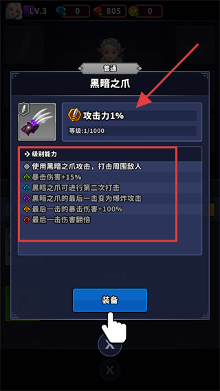 3、穿戴【黑暗之爪】提升攻擊力1%,等級上限1000,點擊裝備增強吸血時的輸出效率。
