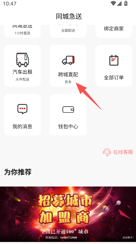 1、打開同城急送進(jìn)入首頁,選擇跨城直配板塊。