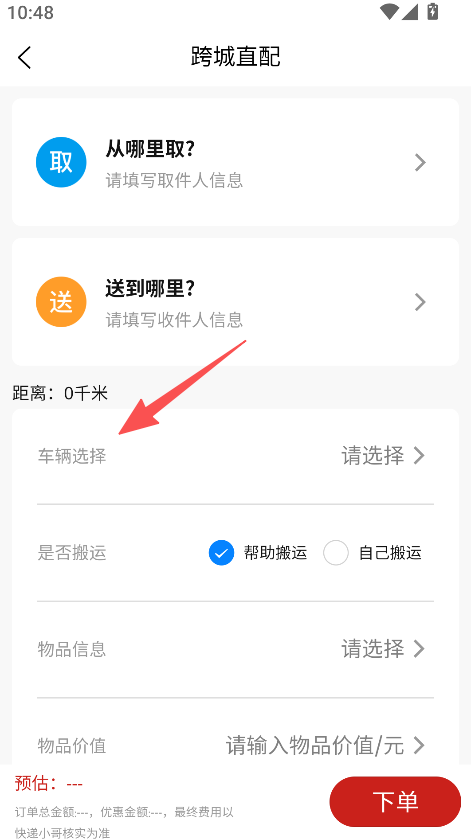 2、在跨城直配頁面填寫取件和收件信息,選擇車輛類型。