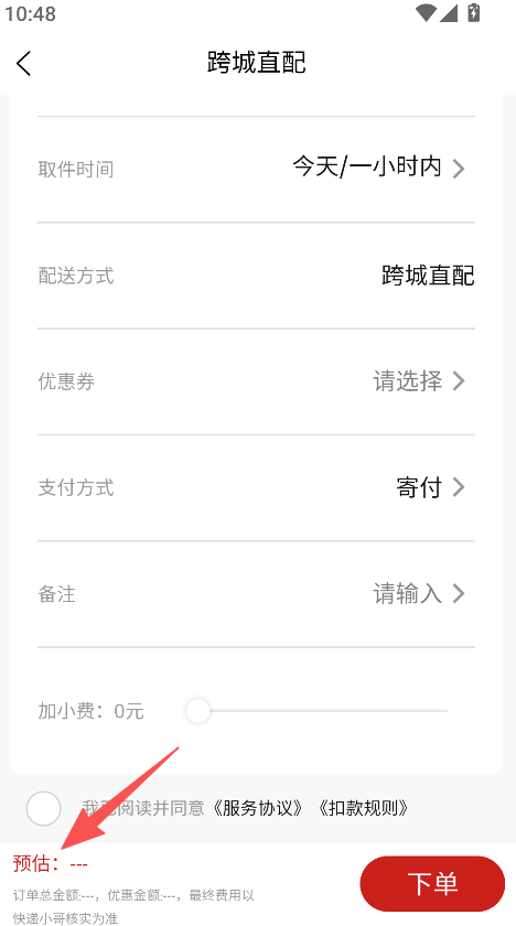 3、具備配送訂單提交功能,勾選服務(wù)協(xié)議后點(diǎn)擊下單,完成跨城配送訂單的提交操作。