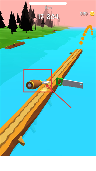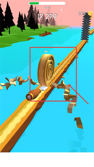 2、切削時獲取被框選的【×3】道具,分數提升至【17279】,持續沿木板推進,避開障礙保持切削節奏。