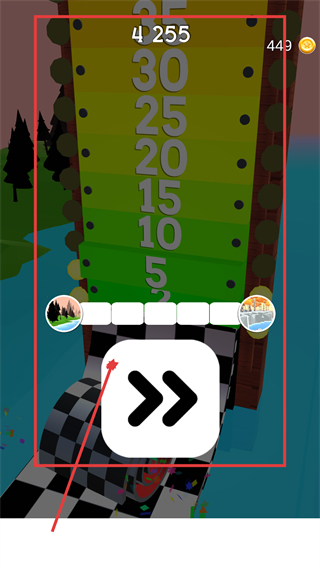 4、關卡完成后顯示分數【4255】,點擊被框選的箭頭按鈕,進入下一關繼續挑戰,積累更多金幣與分數。