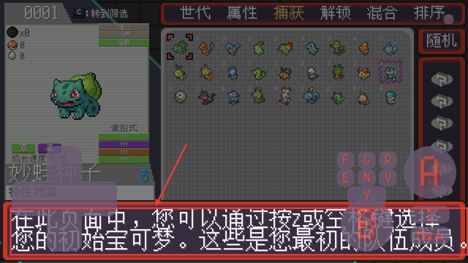 2、在寶可夢(mèng)選擇界面按【Z】或空格選定初始寶可夢(mèng),用10個(gè)指數(shù)點(diǎn)優(yōu)化初始隊(duì)伍配置。
