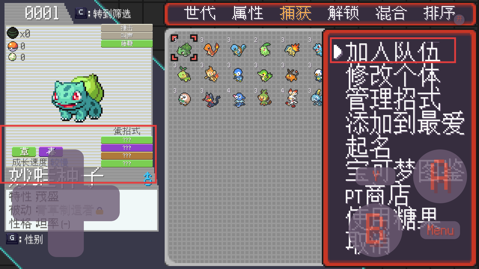 3、寶可夢(mèng)管理界面選【加入隊(duì)伍】編入選中寶可夢(mèng),可修改個(gè)體或管理招式提升戰(zhàn)力。