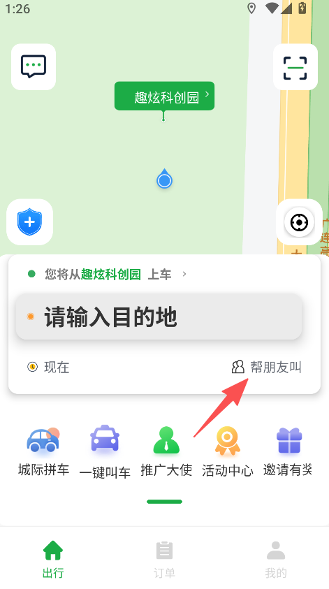1、提供代叫服務功能,進入出行頁面選擇幫朋友叫,進入代叫服務的操作頁面。