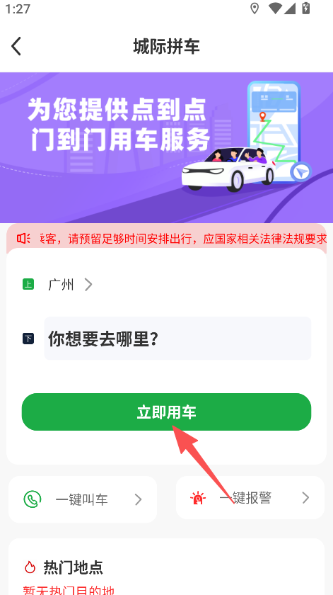 3、具備城際拼車功能,選擇城際拼車板塊,點擊立即用車完成城際出行的叫車操作。