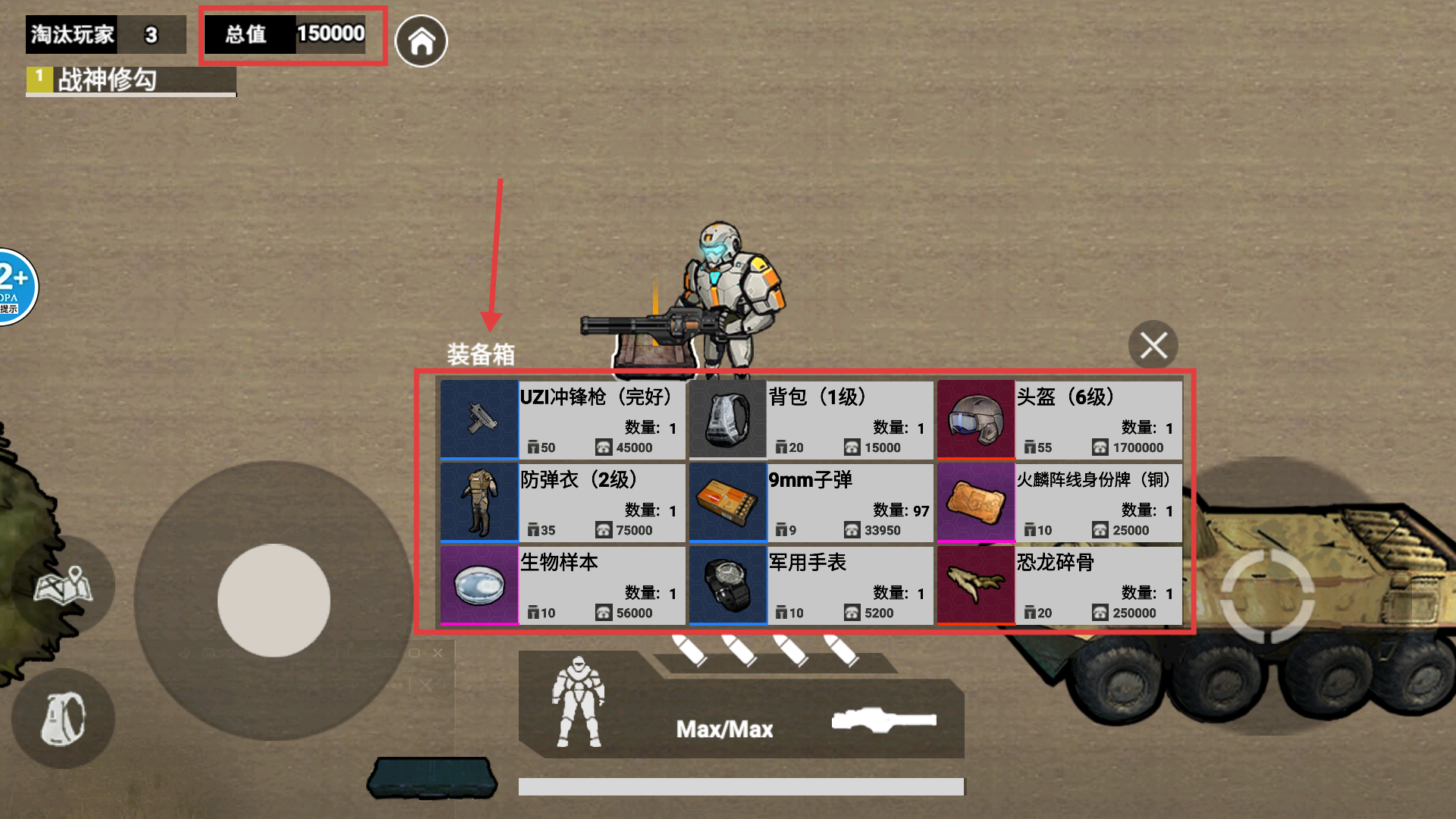 4、打開【裝備箱】優先拾取【6級頭盔】和【2級防彈衣】,收集【9mm子彈】和道具,增強生存與戰斗能力。