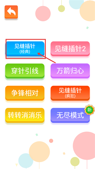 2、在模式選擇界面,點擊被框選的【見縫插針(經典)】,進入經典玩法的關卡,開始基礎的插針挑戰。