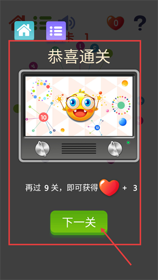 4、通關后出現“恭喜通關”提示,點擊被框選的【下一關】按鈕,繼續挑戰后續關卡,積累進度解鎖獎勵。
