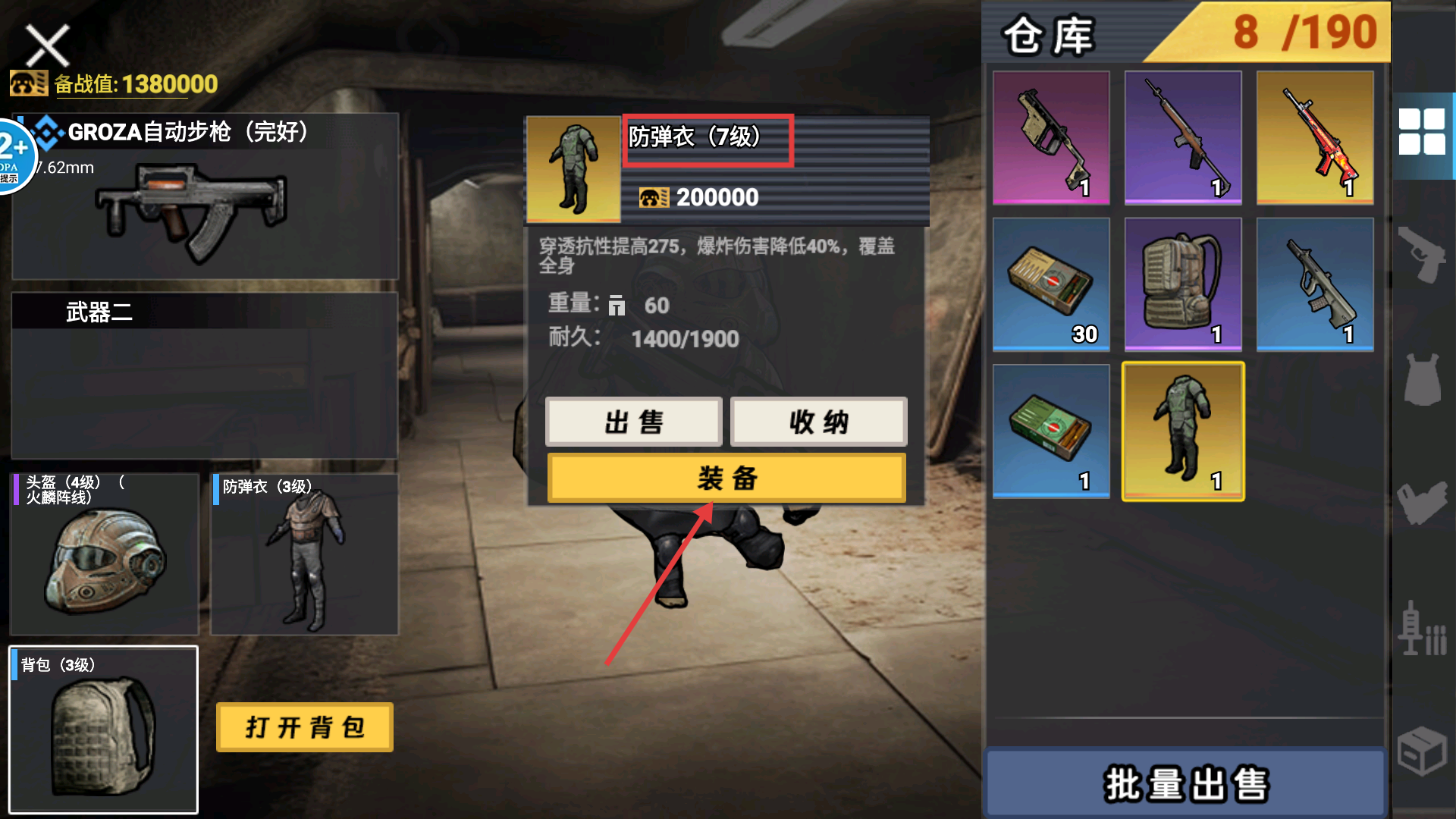 1、進入裝備界面選擇【防彈衣(7級)】裝備,提升穿透抗性與爆炸傷害減免,增強地鐵站戰(zhàn)場生存能力,為后續(xù)戰(zhàn)斗打好防御基礎(chǔ)。