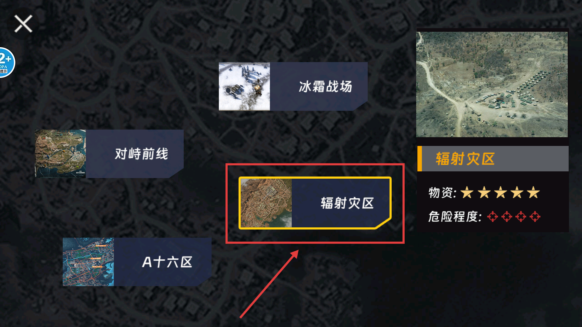 3、選擇【輻射災(zāi)區(qū)】地圖進入,該區(qū)域物資評級五星但危險程度高,需結(jié)合自身裝備實力行動,獲取優(yōu)質(zhì)資源助力逃生任務(wù)。