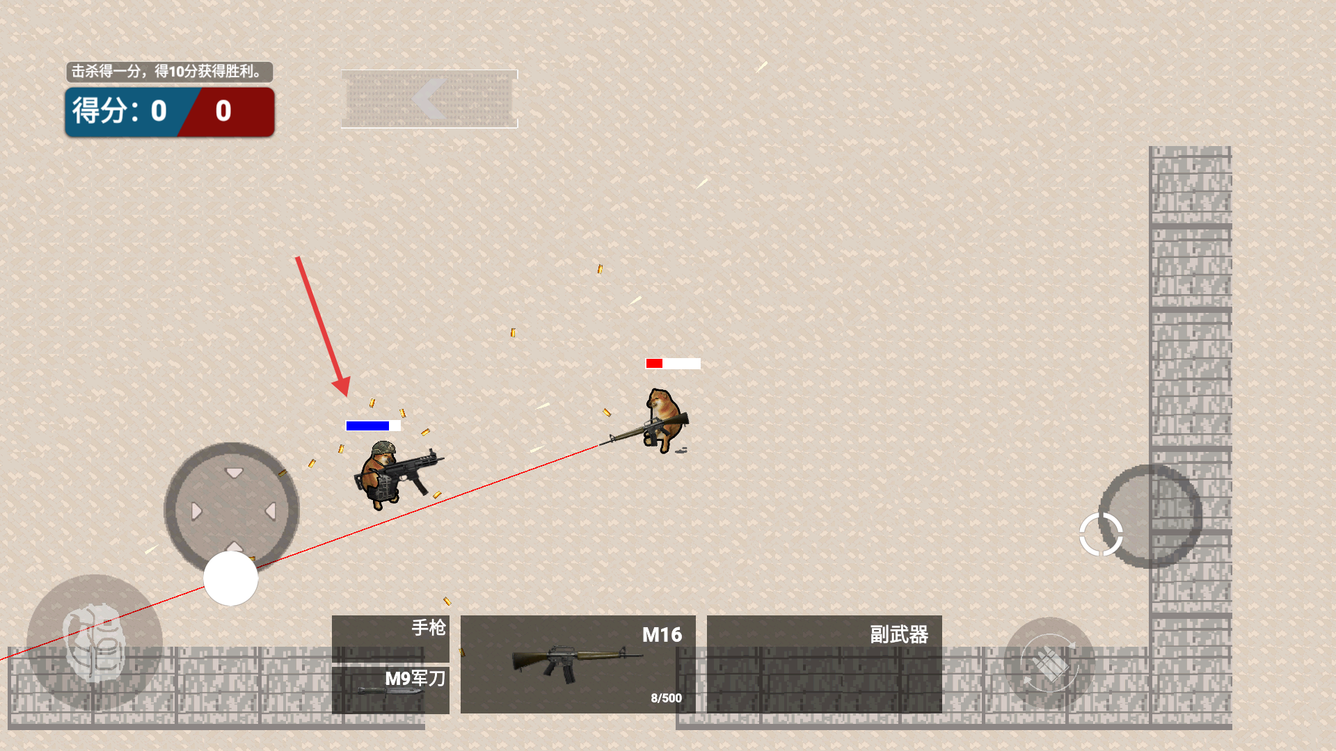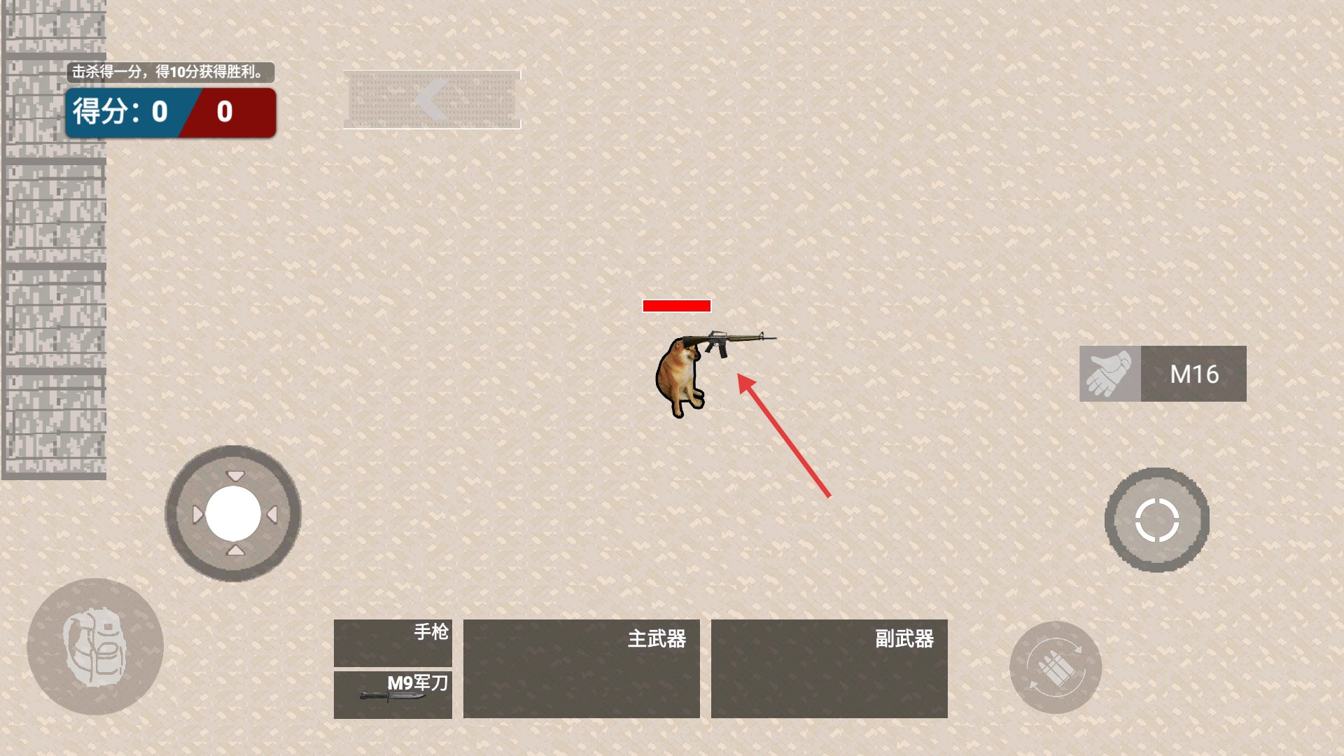 2、戰斗中獲取【M16】武器,調整槍口準星瞄準敵人,每擊殺可得分,積累10分即可獲得戰斗勝利。