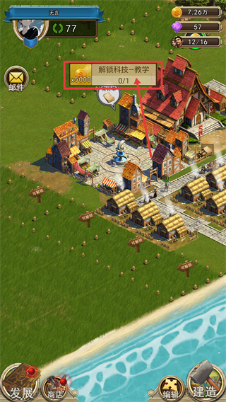 1、留意界面中的【解鎖科技-教學】任務,需消耗【x5000】金幣完成,當前進度為【0/1】,優先推進以解鎖新功能。
