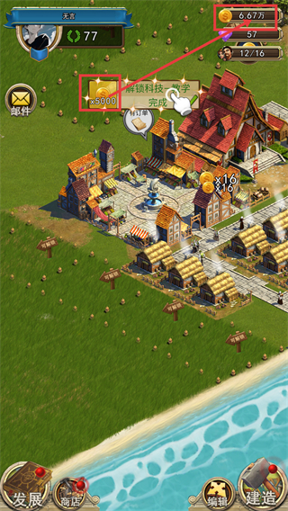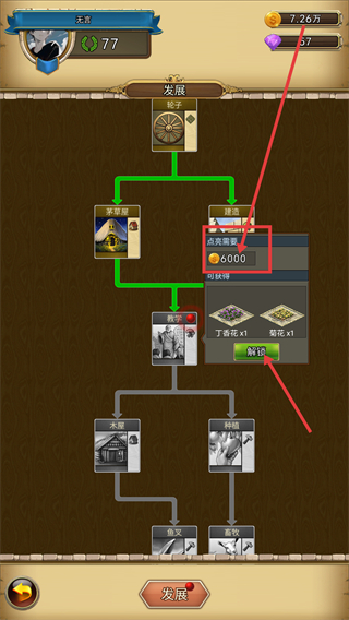 2、進入【發展】界面,解鎖科技需消耗【x6000】金幣,成功后可獲得【丁香花-x1】與【菊花-x1】,助力后續建設。