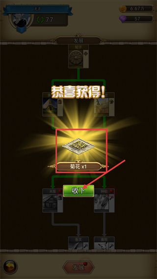 3、解鎖科技后會彈出【恭喜獲得!】提示,獲取【菊花-x1】,點擊【收下】按鈕領取該道具,用于后續玩法推進。