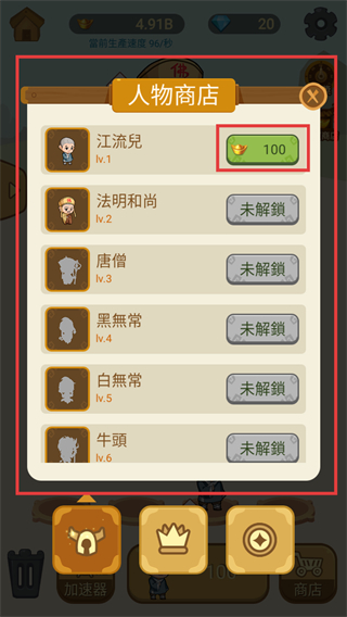 1、進入人物商店后,消耗對應資源解鎖人物,其余角色當前顯示未解鎖,可后續積累資源逐步解鎖。